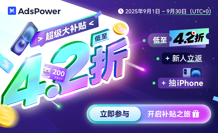 9月1日–30日,AdsPower超級大補貼限時開啟!套餐低至4.2折,新人首付立返50%贈送金,滿額送京東卡+抽iPhone16。