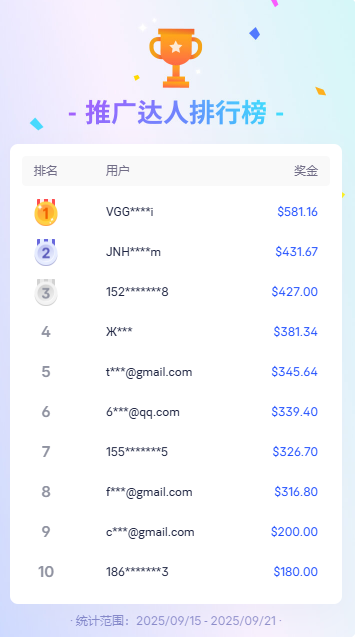 【8 月推廣月榜出爐】9 月沖榜福利:邀新額外獎勵 $5!